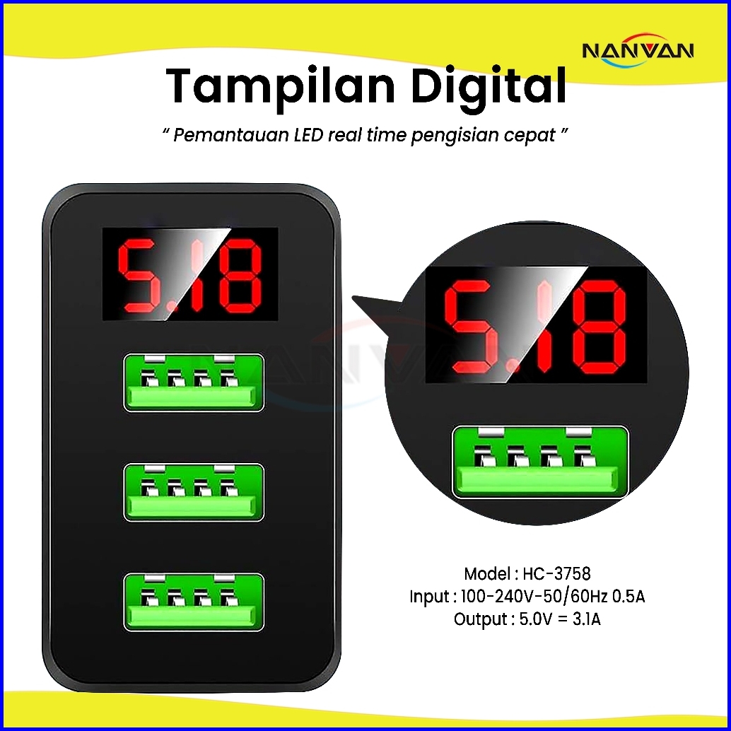 Nanvan Nvn-ptc02 Head Adapter Charger Fast Charging 3 Usb Dengan Lcd Monitoring