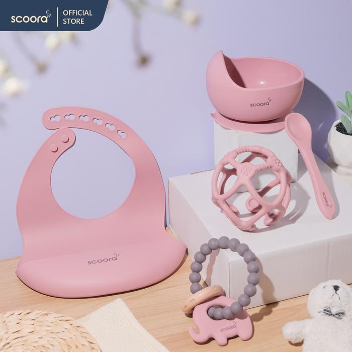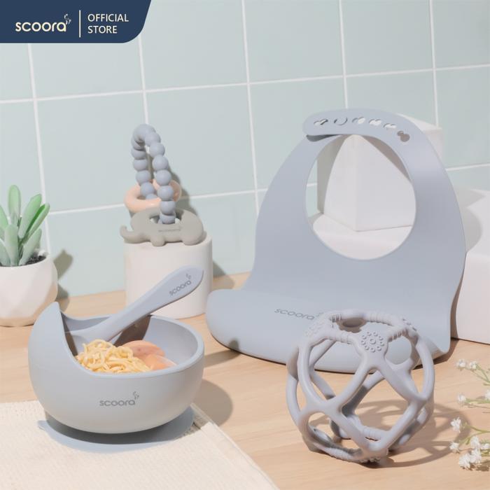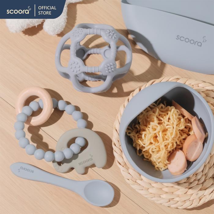 Alat Makan Bayi SCOORA Silicone Premium Alat Makan Silikon anak 5 in 1 With Teether Chain Elephant