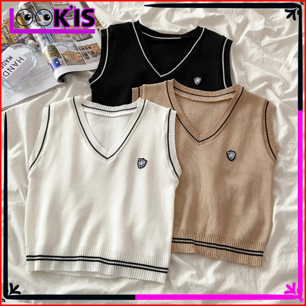 Look Is Vest Rompi Rajut Tanpa Lengan Premium Atasan Sweater List Blous Strip Wanita Outer Top V-neck Knit Crop Korean S