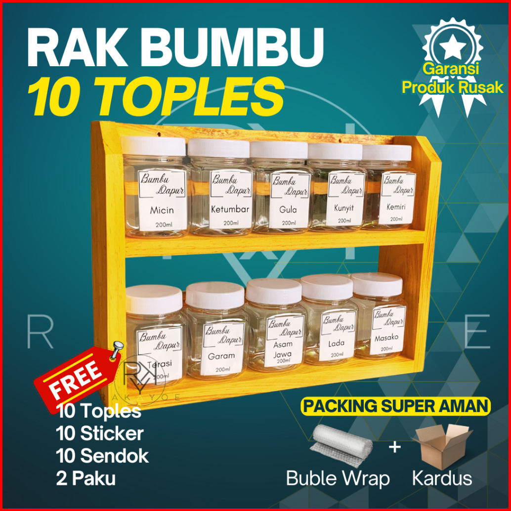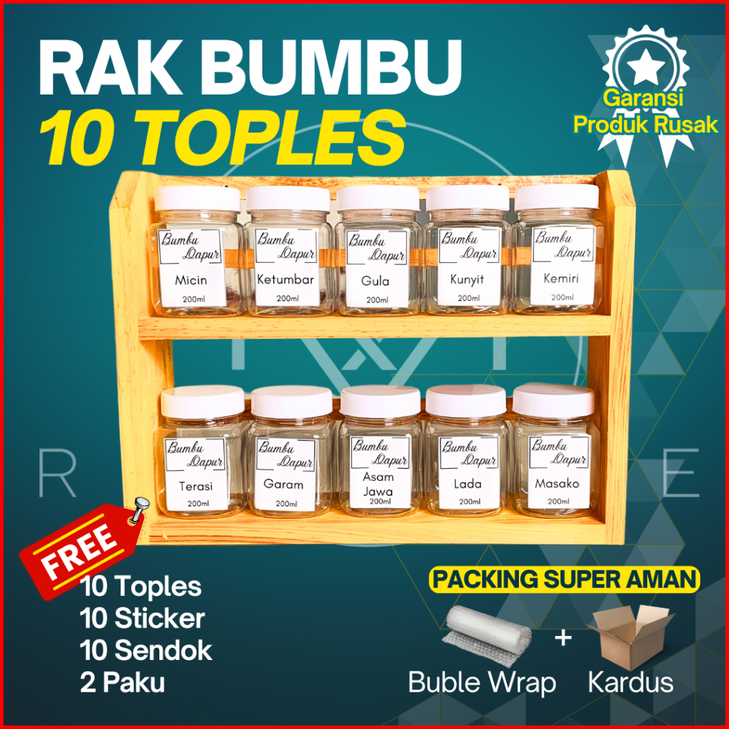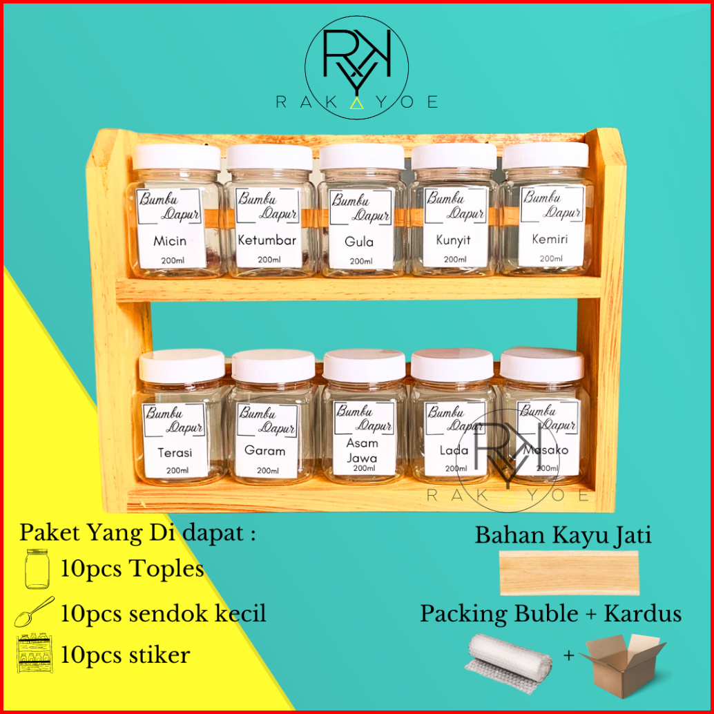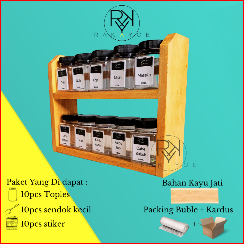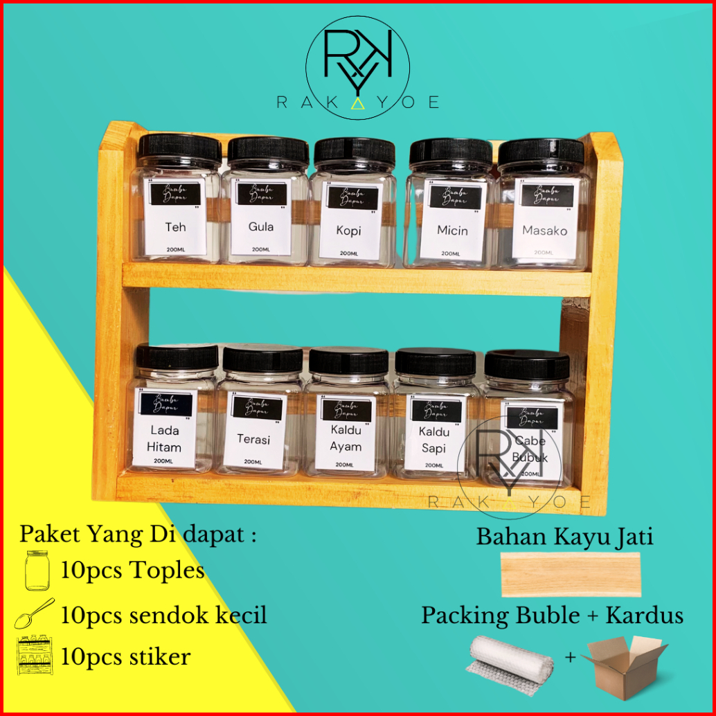 Rak Dapur Serba Guna Tempat Bumbu Kayu 2 Susun Dengan 10 Toples Dan 10 Stiker Bumbu