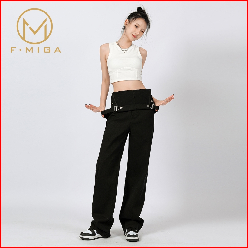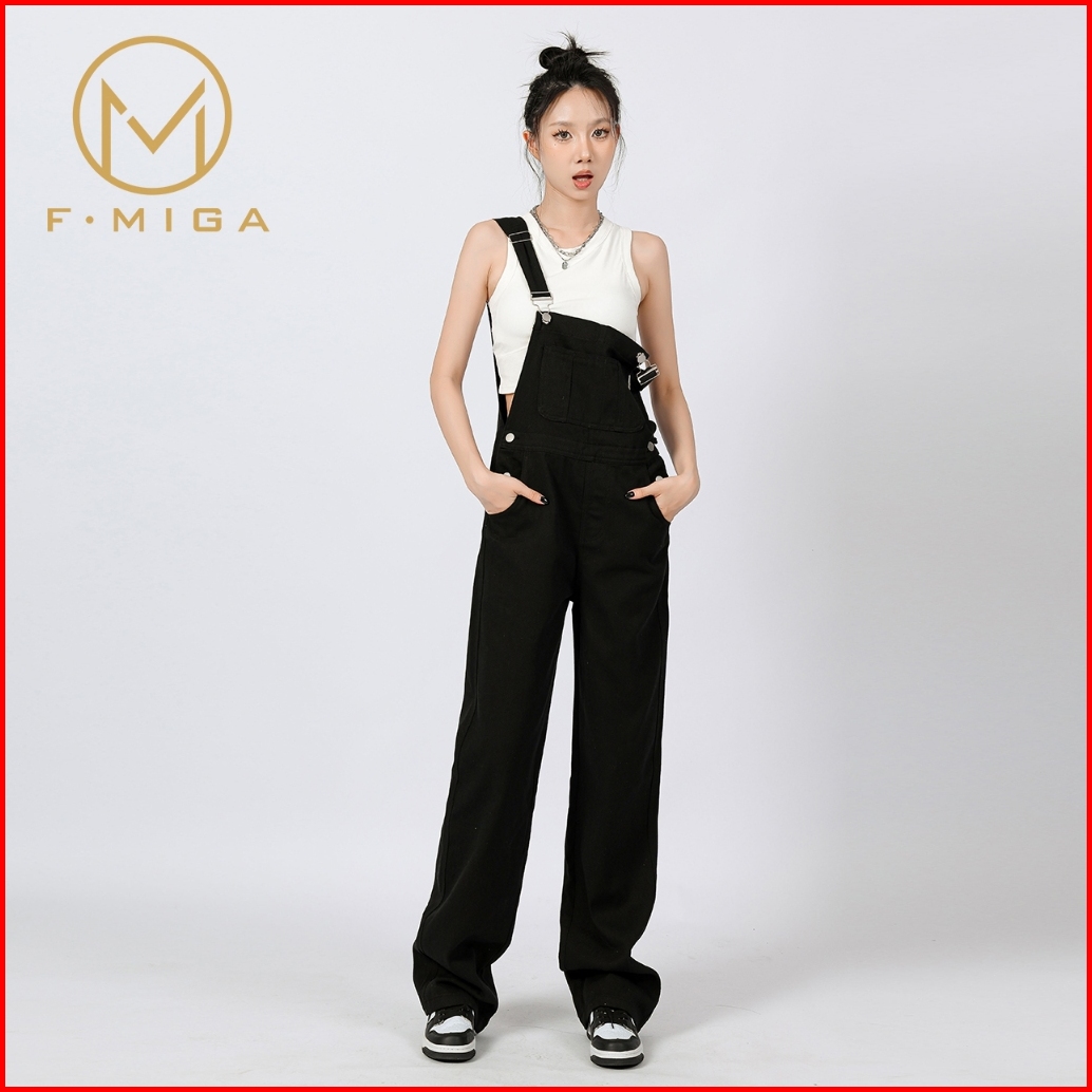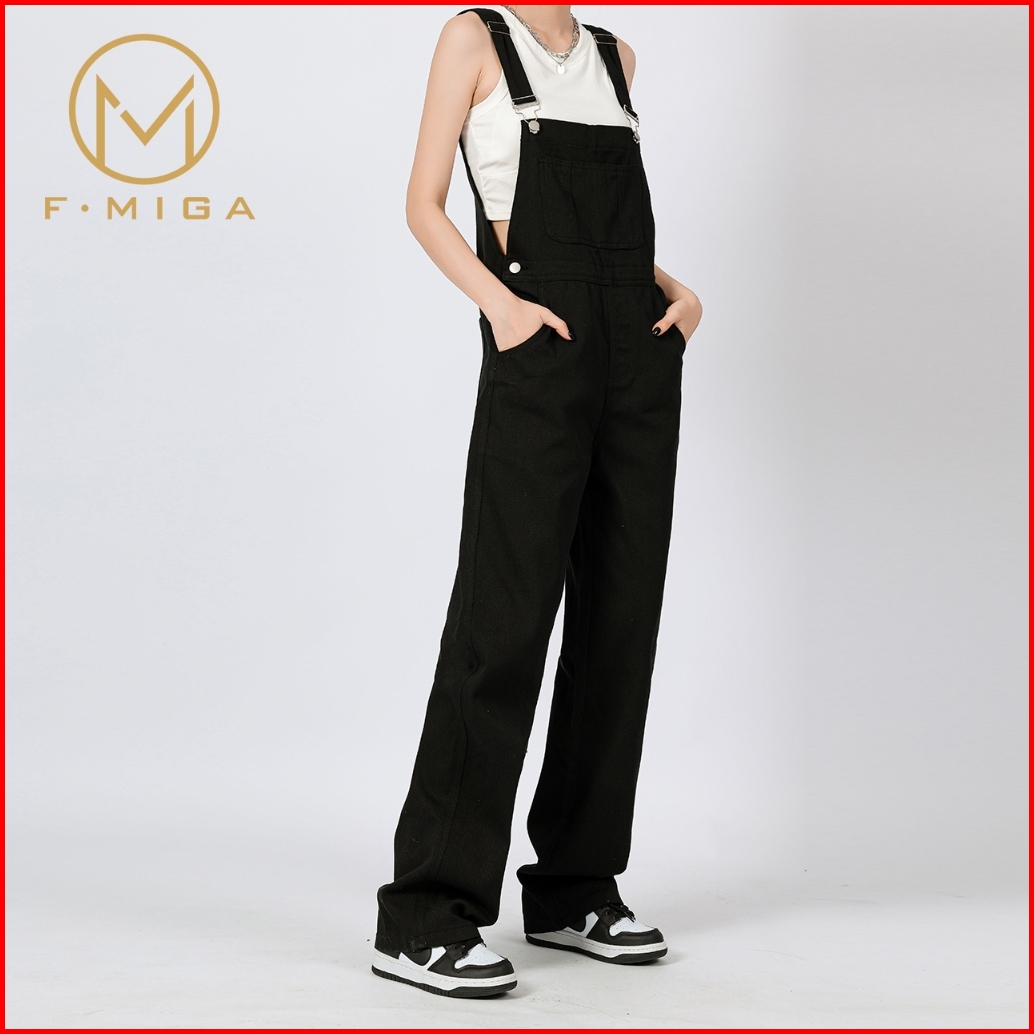 F Miga C51 Korean Style Cargo Wide Leg Playsuit Overall Jeans Wanita Kodok Panjang Celana Jeans Wanita - Hitam