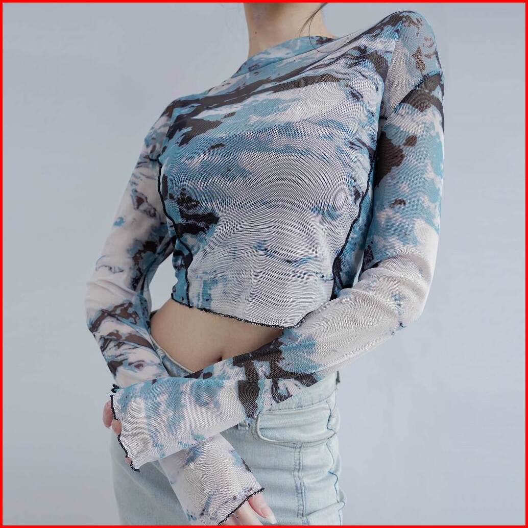 99koutlet Atasan Cropped Transparan Tie Dye Turtle Neck Lengan Panjang 2271 S M L Xl