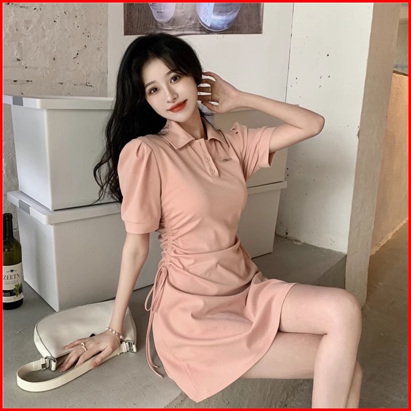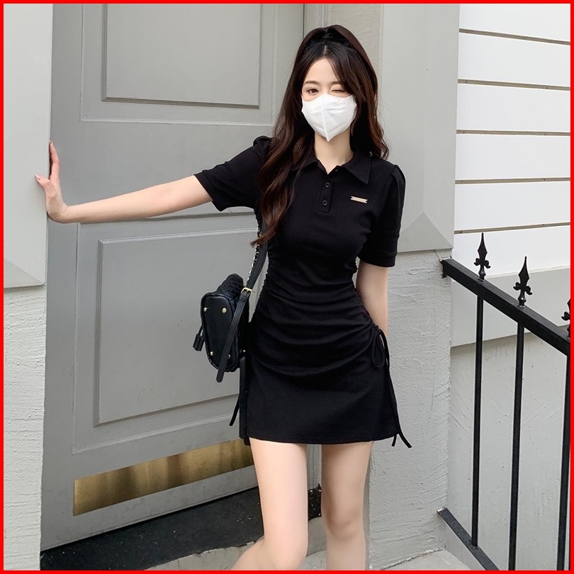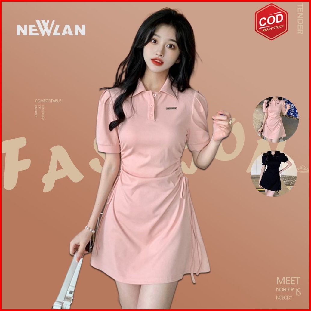Newlan Qz090 Short Sleeve V-neck Button Mini Dress Kerah Wanita Lengan Pendek Basic Polo Button Up Front Pocket Pakaian