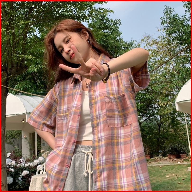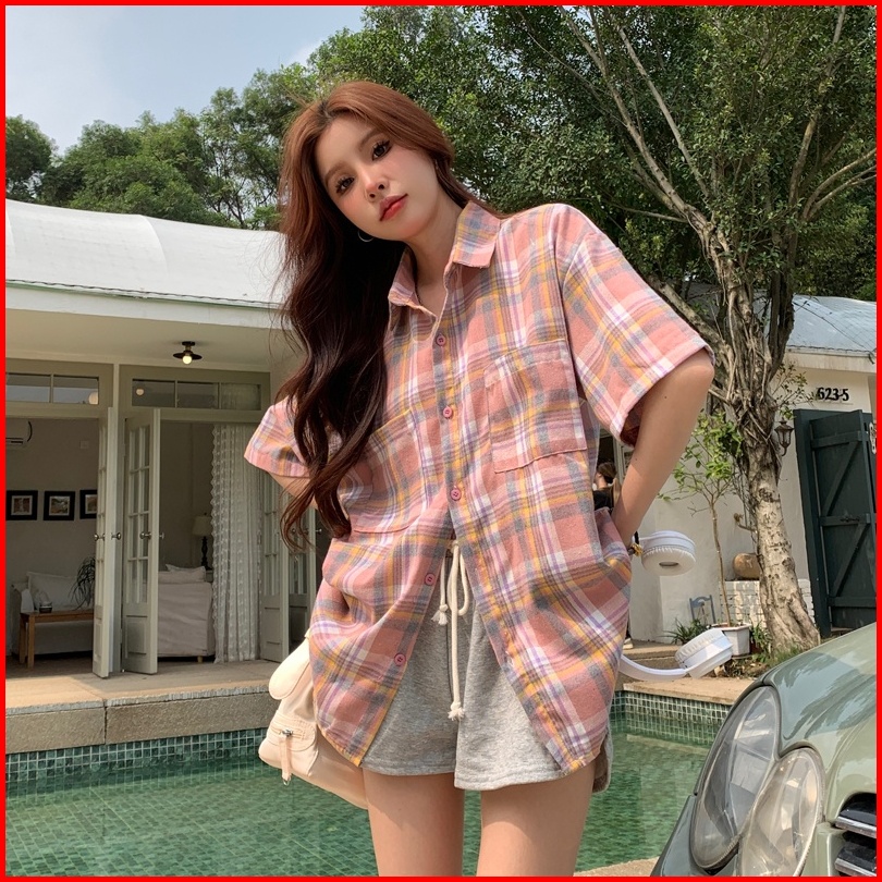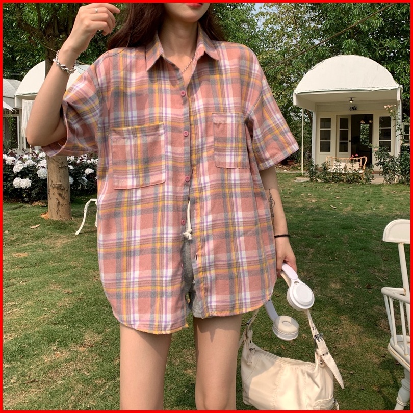 Yuruma Kemeja Kotak-kotak Merah Muda Jepang Kardigan Kerah Polo Retro Atasan Lengan Pendek Siswa Longgar