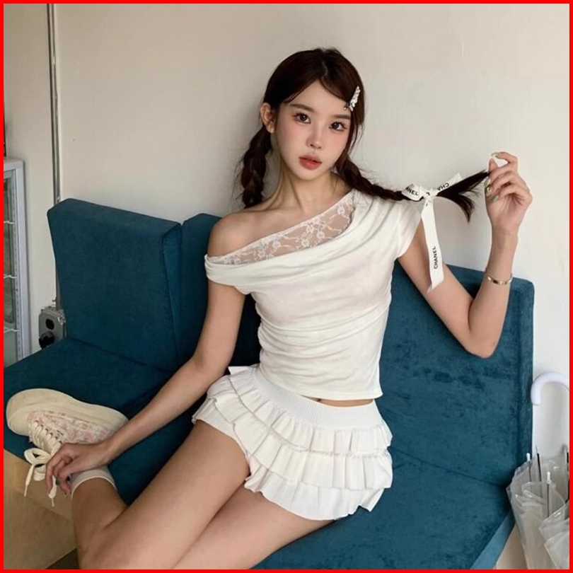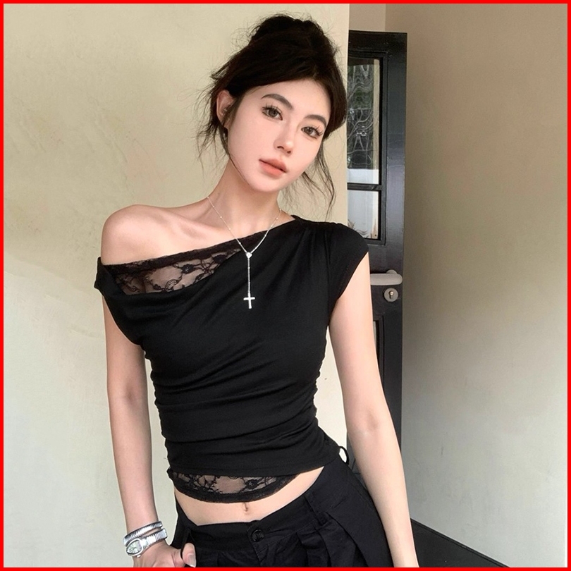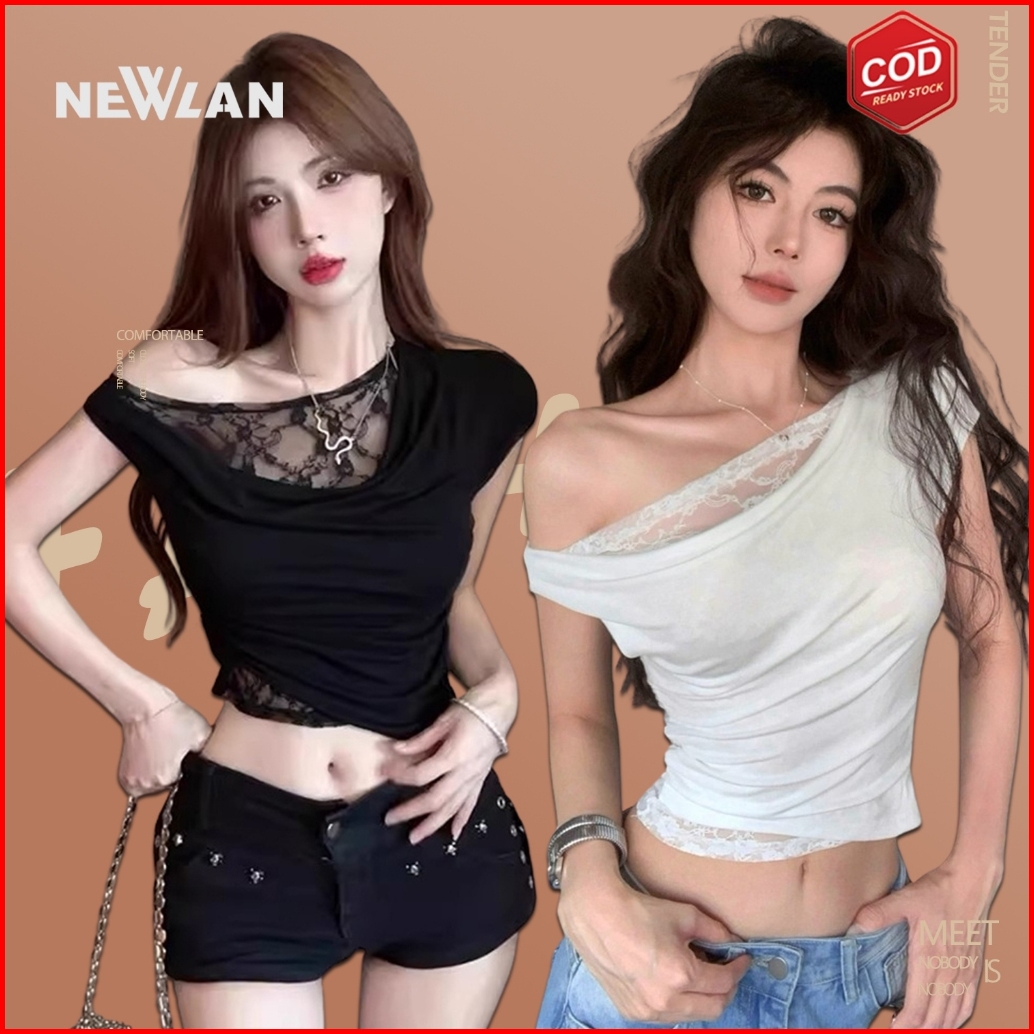 Newlan Zz122 Kaus Baju Lengan Pendek T-shirt Wanita Atasan Terbar Bahu Terbuka Pas Ramping Kaus Tepi Renda Lace Korean S