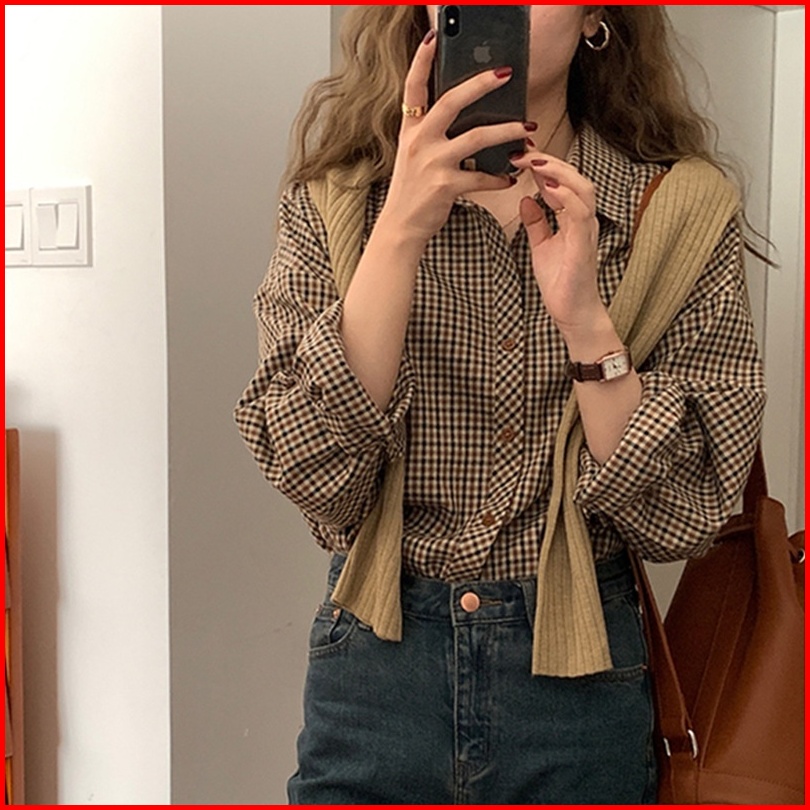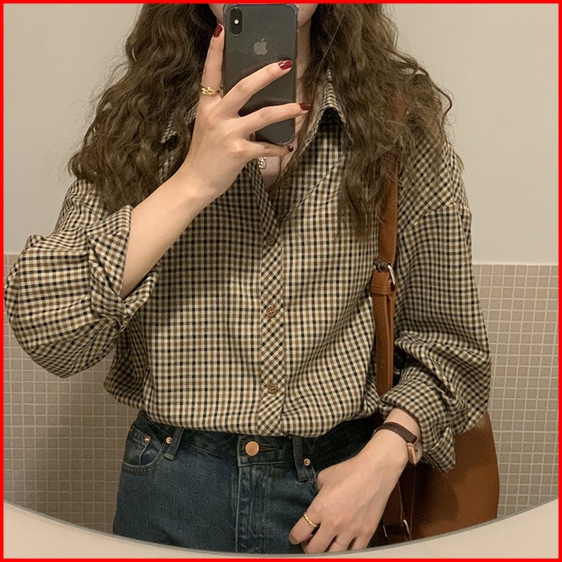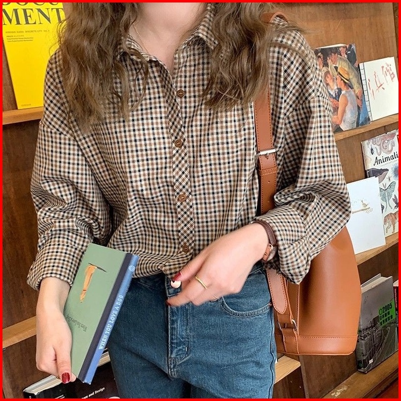 Yikoo-oversize Kemeja Shirt Atasan Kotak-kotak Wanita Retro Top Big Size