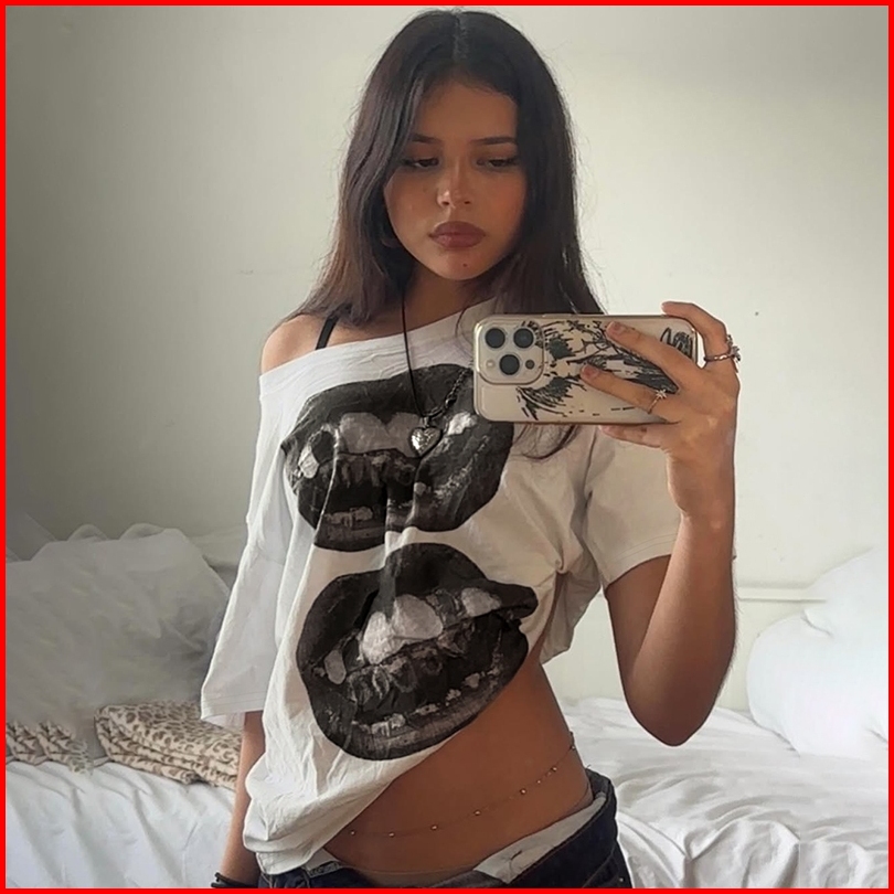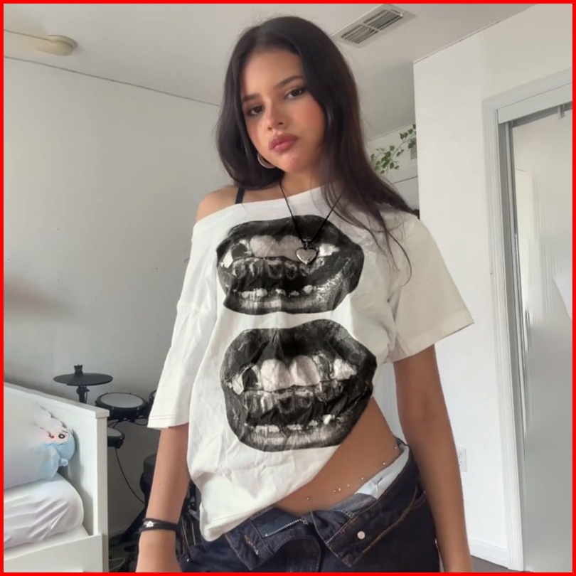 Auzy Mulut Tshirt Y2k Asymmetrical Offshoulder Top Ahs Streetwear Stockholm Vintage Retro Aesthetic Kaos Keren