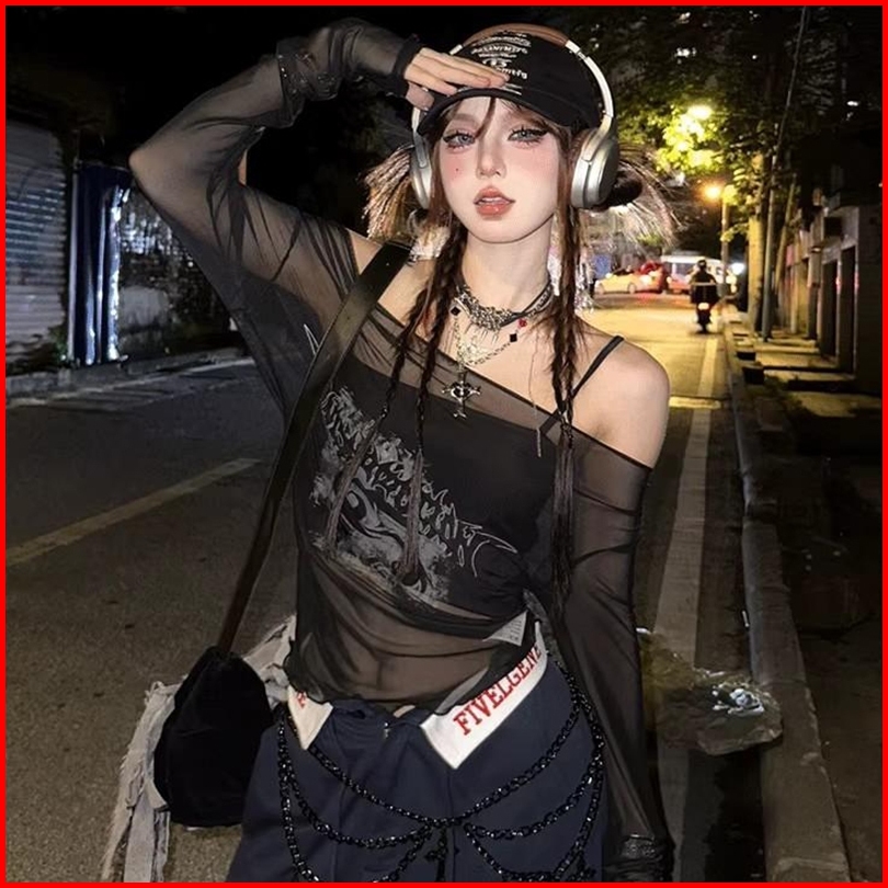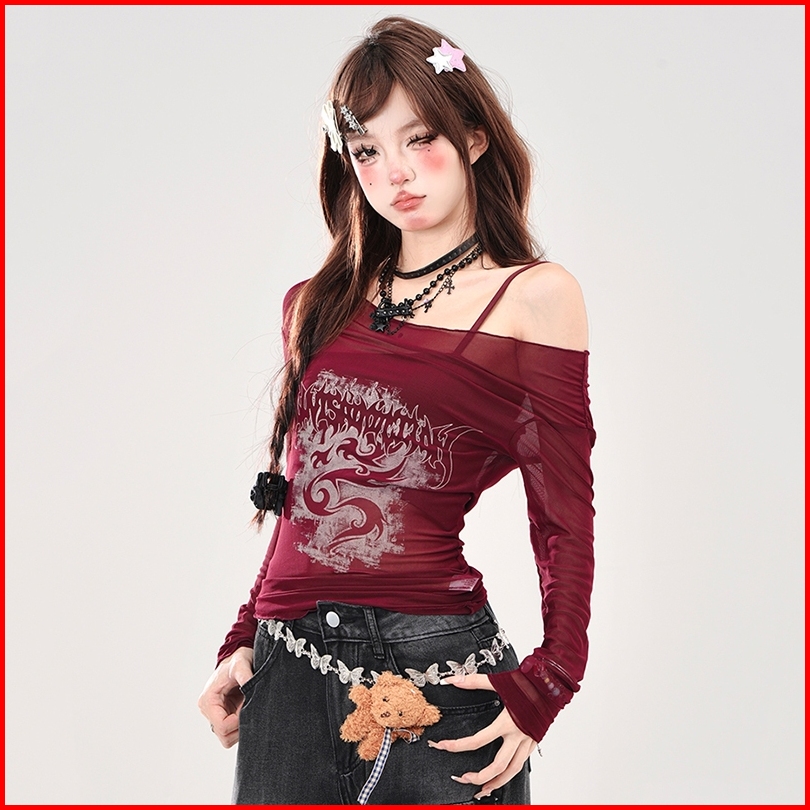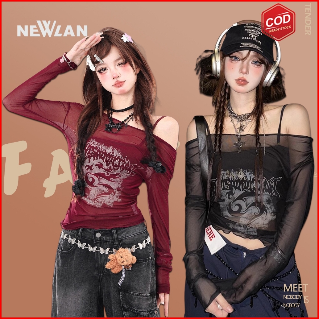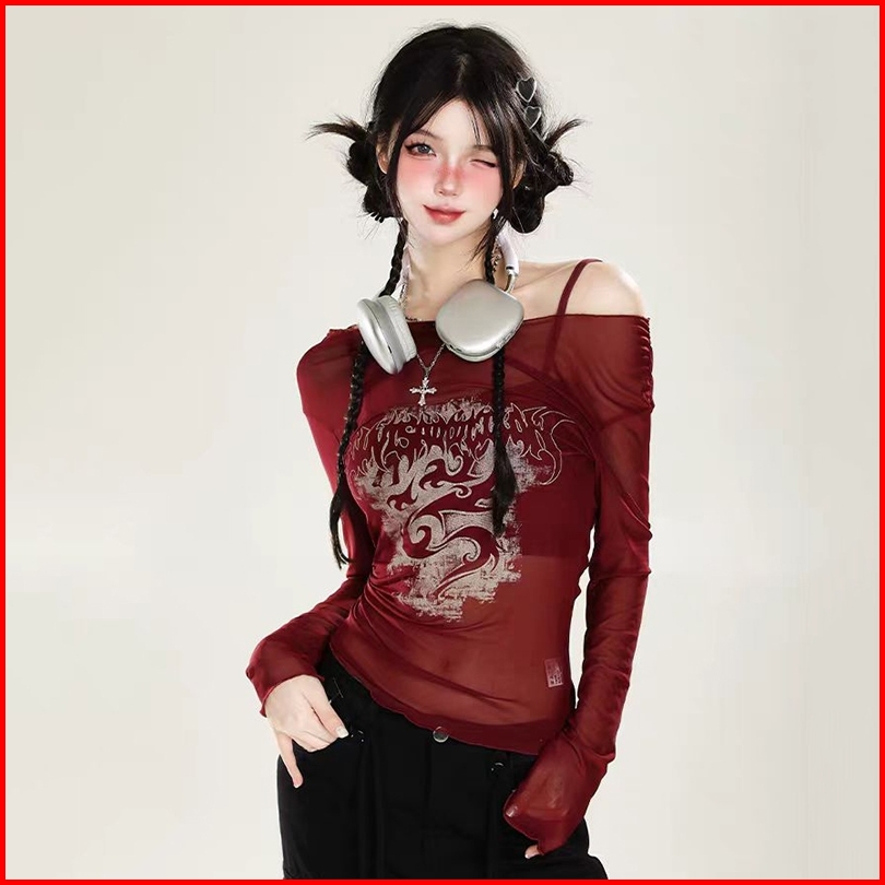 Newlan Zz125 Atasan T-shirt Kaus Lengan Panjang Merah Off Shoulder Top Slimfit Wanita Jersey Retro Croptop Through Sexy