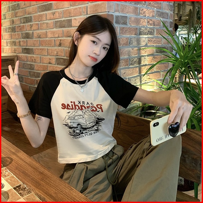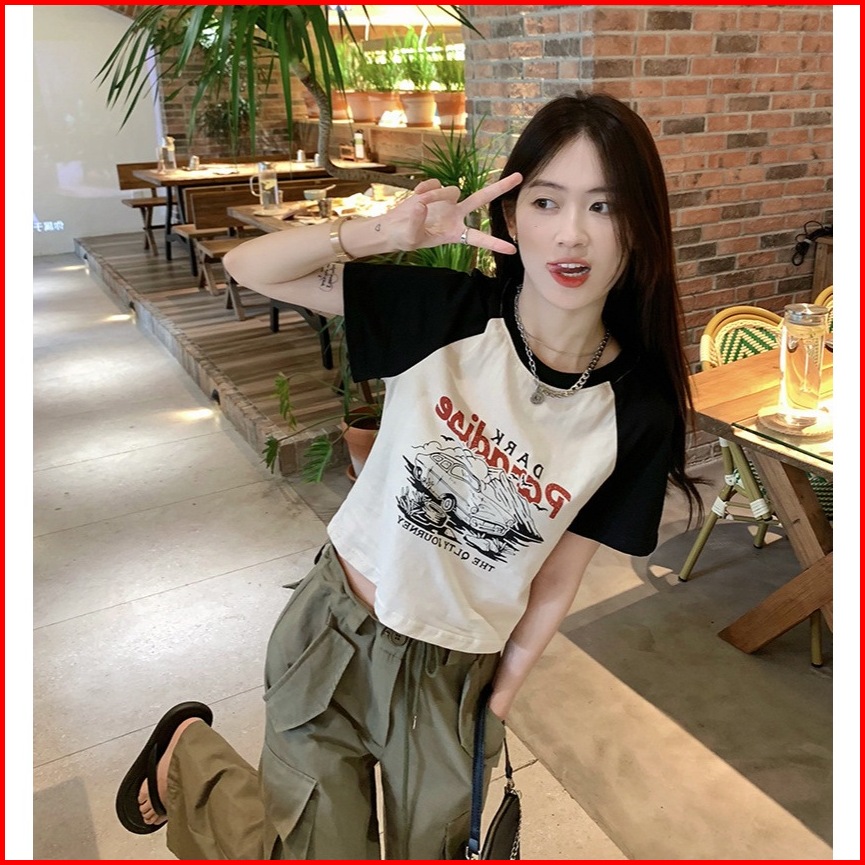 Miss O Bj1895 Baju Atasan Kaos Korean Crop Top Dark Paradise Wanita Fashion T-shirt Lengan Pendek