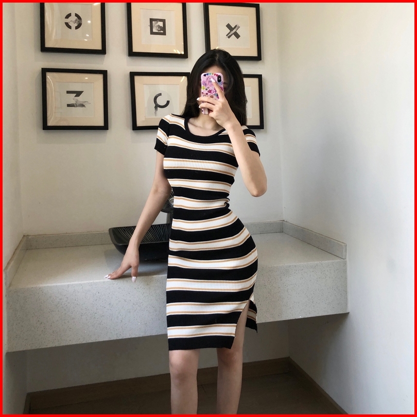 Sexy Dress Summer Split Striped O Neck Bodycon - Gestrick