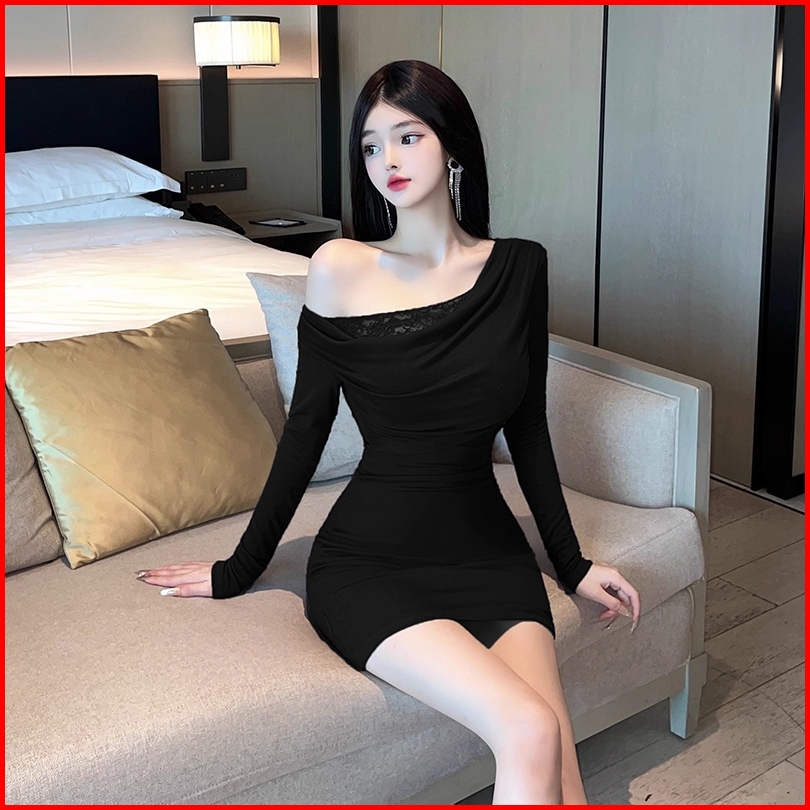Newlan Qz252 Mini Dress Sexy Lengan Panjang Wanita Gaya Korea Model Dress Pendek Dress Wanita Off Shoulder Long Sleeve A