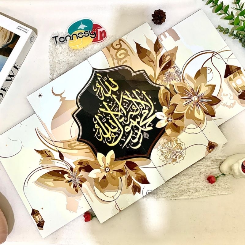 TENNESY Hiasan Dinding Aesthetic 1 Set Islamic Flowers With Gold Kaligrafi 4 Panel Wall Decor