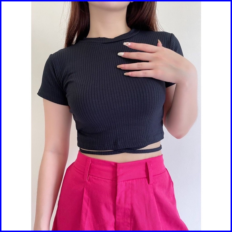Crop Top Wanita Milan Silang Pinggang Knit Rib
