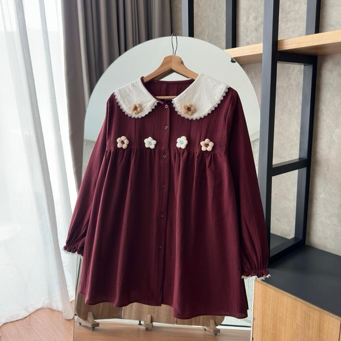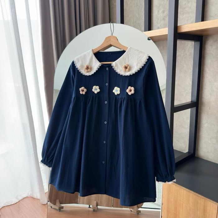 Baju Kemeja Wanita/Rok Wanita By.HANA 470 Linen Shirt Floral Crochet Baju Atasan Panjang Wanita