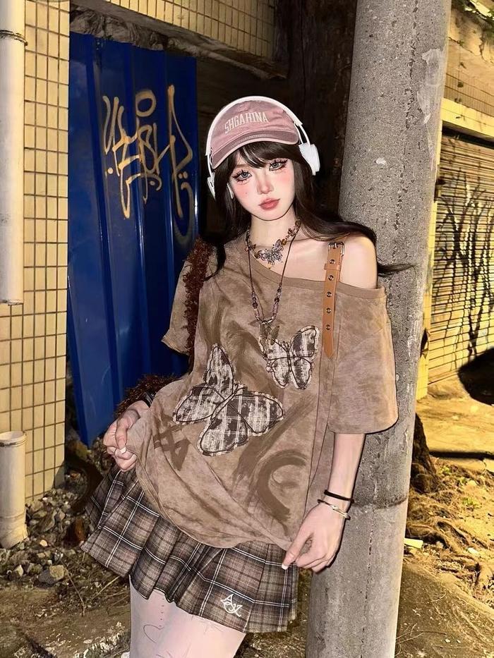 Baju Kemeja Wanita/Rok Wanita ReadyKaus Lengan Pendek Katun Murni Bahu Terbuka Pola Bordir Kupu-kupu