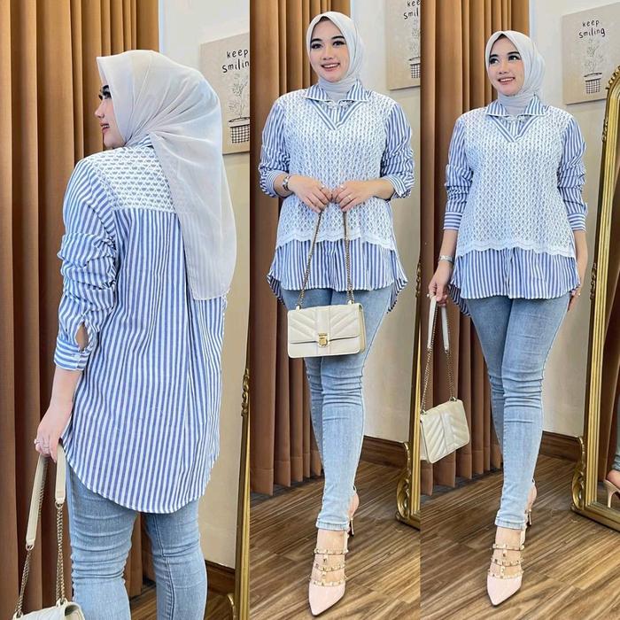Baju Kemeja Wanita/Rok Wanita Kemeja Sassy salur combi brukat lengan panjang busui friendly Katun