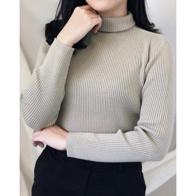 Kaos Turtleneck Leher Tinggi Wanita Lengan Panjang Bahan Rib Premium Tebal Lembut Dan Adem