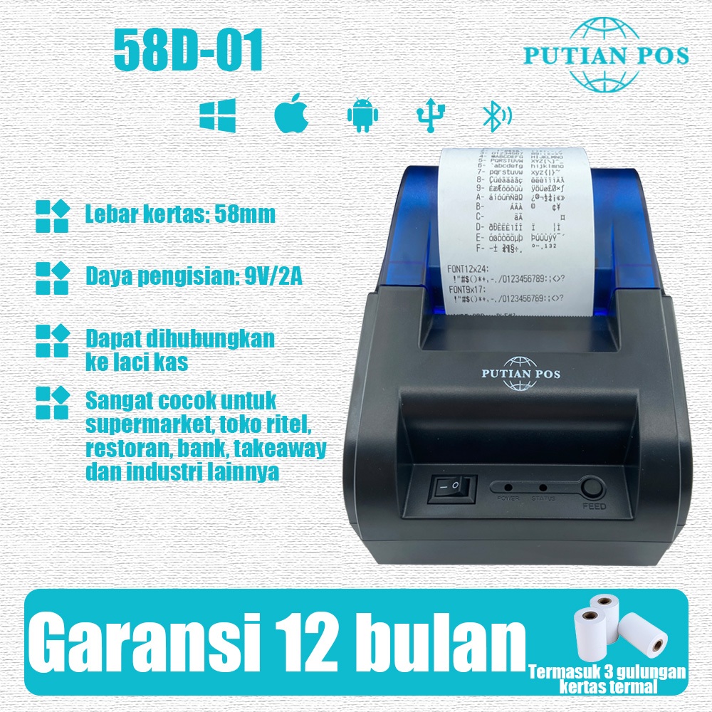 PUTIAN POS Printer Bluetooth Termal 58D-01 Kasir Printer Mini Portabel/Dukungan PPOB (Bluetooth+USB)