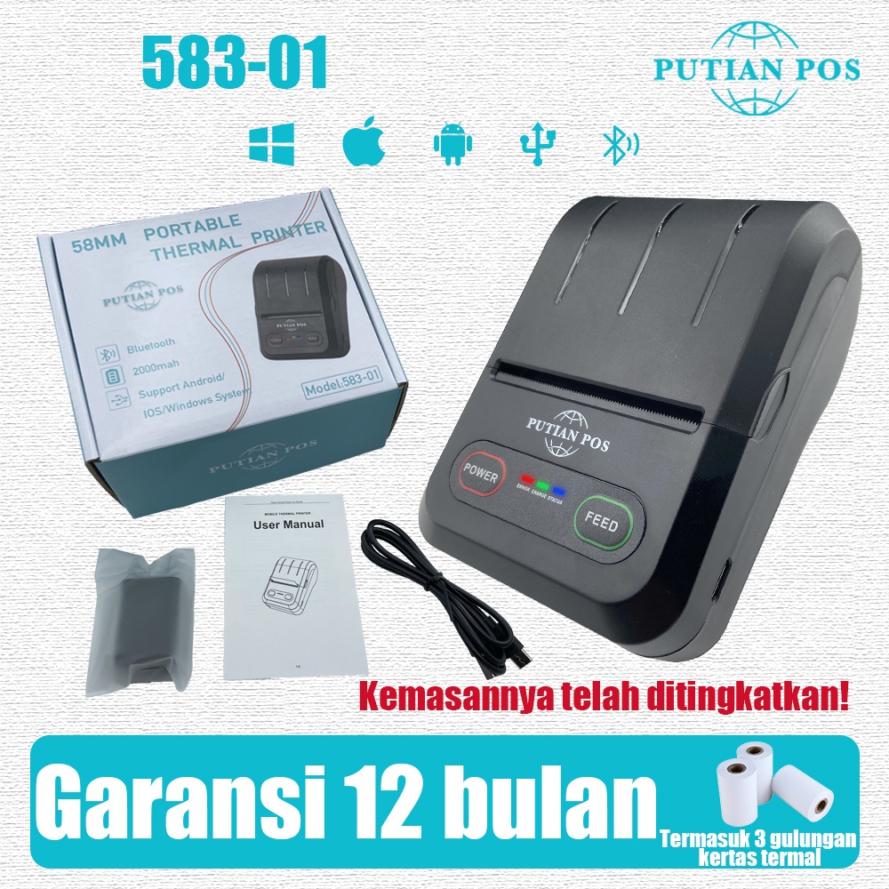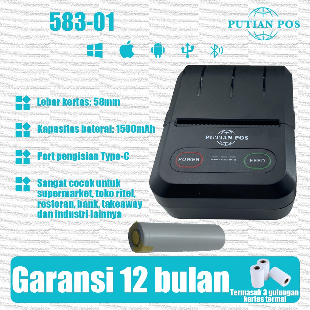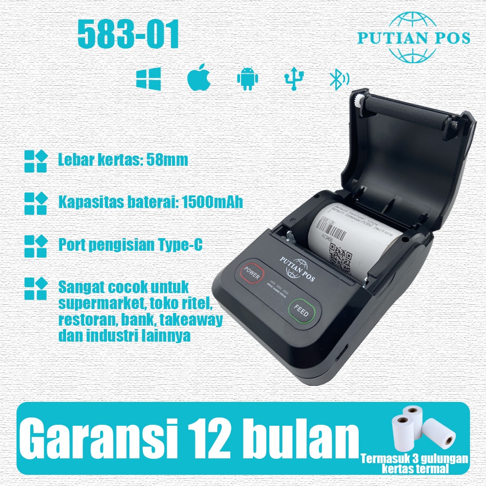 PUTIANPOS 58mm Printer Tanda Terima Termal Portabel Bluetooth