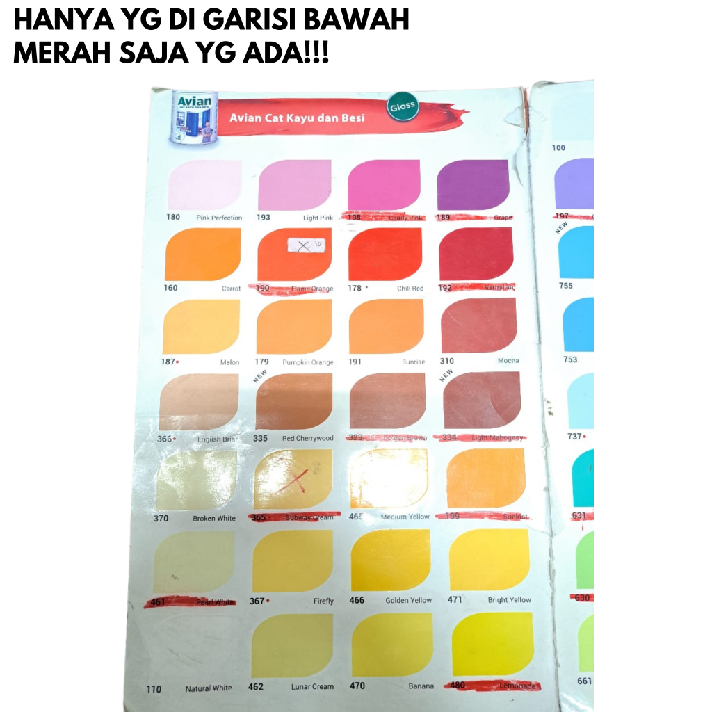 ALOEVERA 660, BRIGHT BLUE 755, CANDY BROWN 301, CANDY PINK 198, CINNAMON 309, DARK GREY 915, DEEP OCEAN 750, DOVE GREY 911, EVERGREEN 650, FLAME ORANGE 190, GOLDEN BROWN 329, GOLDEN HONEY 328, GRAPE 189, HITAM DOP, KIWI 630, LAUREL 657, LEMONADE 480, LIGHT MAHOGANY 334, MAHOGANY BROWN 331, MAROON 194, MINT 631, OCEAN BLUE 733, ORCHID VIOLET 197, PEARLY WHITE 461, PUTIH DOP, SADDLE BROWN 306, SEA BLUE 752, SPRING GREEN 607, SUEDE 303, SUNKIST 199, SUPER BLACK, SUPER WHITE, TWILIGHT BLUE 731, VERMILLION 192