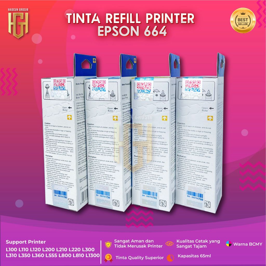 Tinta Epson 664 Refill 70ml Black Cyan Magenta Yellow Untuk Epson L100 L110 L120 L121 L130 L200 L210 L220 L300 L310 L350 L355 L360 L365 L380 L385 L405 L455 L550 L555 L565 L605 L1300 L1455