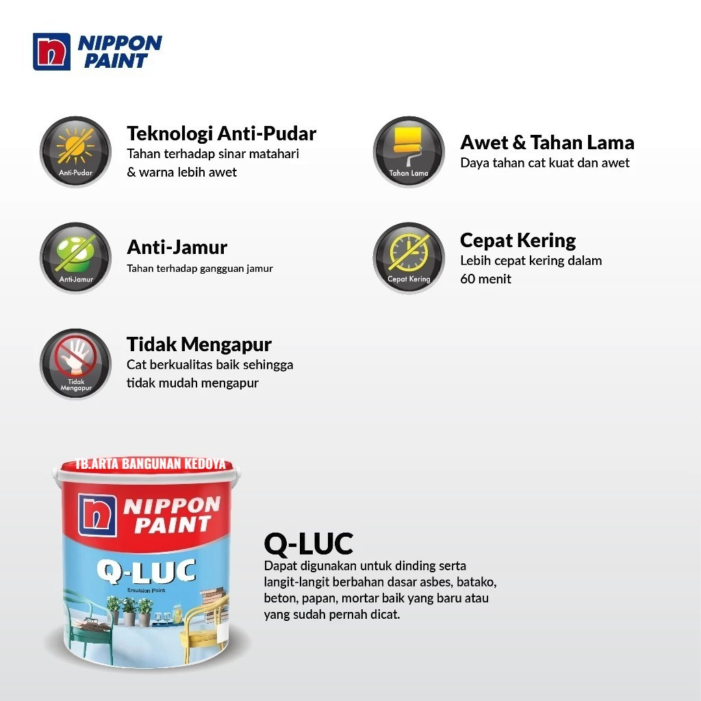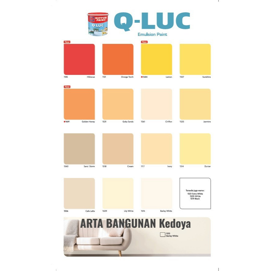 1505 Putih, 1117 Ivory, 1131 Orange Torch, 1154 Hijau Telor, 1185 Hibiscus, 1501 Extra White, 1503 Blue White, 1509 Lily White, 1514 Durian, 1515 Barley White, 1516 Sunset, 1518 Cream, 1519 Black, 1523 Victoria, 1524 Fresh Green, 1525 Jasmine, 1526 Blue Beauty, 1529 Soft White, 1531 Goby Sands, 1534 Marina, 1539 Lakestone, 1540 Green Freeway, 1541 Atlantic, 1546 Lime Green, 1547 Swimming Blue, 1548 Stone Grey, 1549 Copper Grey, 1550 Graycloth, 1552 Pink Posy, 1553 Lavender Print, 1554 Happy Fuschia, 1555 Peace Blue, 1556 Cafe Latte, 1557 Sunshine, 1560 Sand Storm, 1561 Chiffon, 1562 Candy Pink, 1657 Bright Green, 1671 Moon Glow, 1688 Real Morado, 1690 Clear Sky, SP1533 Sky Blue, SP1684 Lemon, BGG1681D SpringVigor, SP1691 Golden Honey