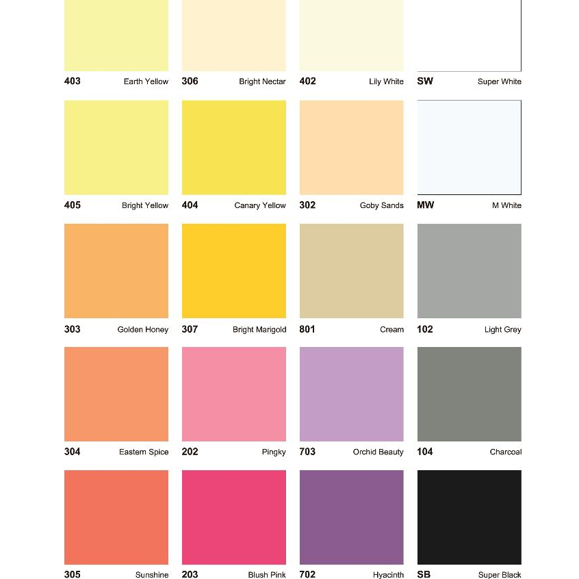 WHITE SWS, LIME GREEN, RED CHILLI, BLUE RIVER, PARADISE GREEN, SKY BLUE, APPLE GREEN, ATLANTIC, BRIGHT GREEN, BRIGHT BLUE, ROMANTIC GREEN, EARTH YELLOW, BRIGHT NECTAR, LILY WHITE, SUPER WHITE, BRIGHT YELLOW, CANARY YELLOW, GOBY SANDS, M WHITE, GOLDEN HONEY, BRIGHT MARIGOLD, CREAM, LIGHT GREY, EASTERN SPICE, PINGKY, ORCHID BEAUTY, CHARCOAL, SUNSHINE, BLUSH PINK, HYACINTH, SUPER BLACK