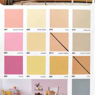 624 M White, SW Super White, 686 Grand Ocean, 685 Lily Pink, 680 Green Tea, 661 Leafy, 643 Jonquil, 641 Country Cream, 662 Earth, 660 Candy, 691 Canary, 614 Butter Milk, 670 Ivory, 690 Avocado, 683 Sweet Blue