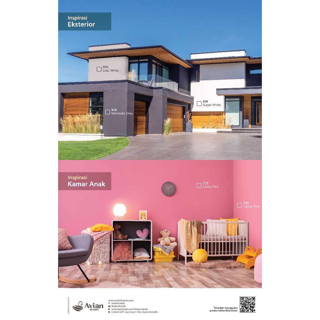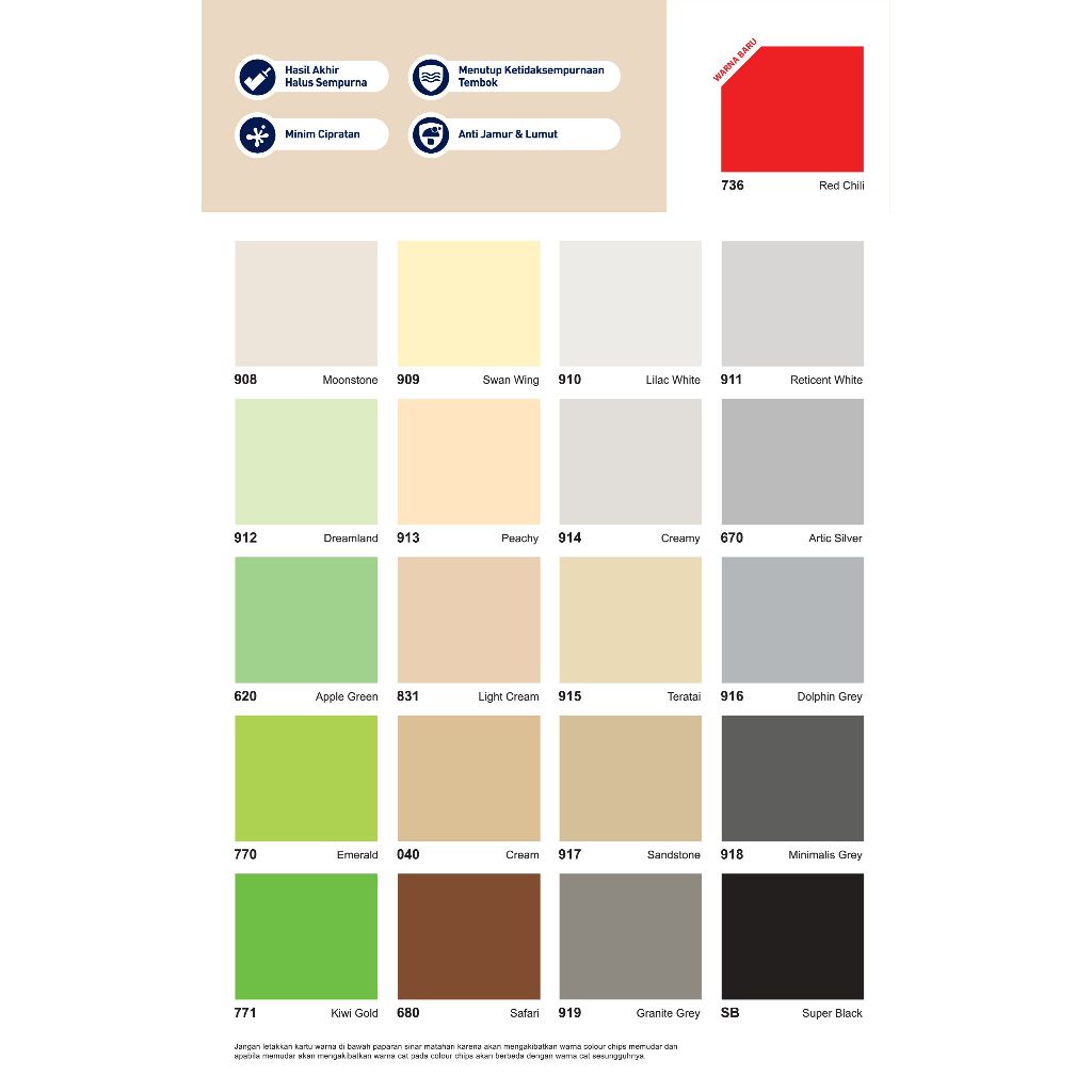 040 Cream, 601 Blue Romance, 602 Skyway, 620 Apple Green, 670 Artic Silver, 680 Safari, 700 Azure Blue, 710 Moon Glow, 712 Telur Bebek, 720 Candy Pink, 725 Chery Pink, 735 Bright Red, 745 Fiesta, 752 Champagne, 755 Golden Yellow, 765 Sun Flower, 770 Emerald, 771 Kiwi Gold, 831 Light Cream, 901 Marigold, 902 Supra White, 903 Brilliant White, 904 Pinky, 905 MW Putih Salju, 906 Citrus Grove, 907 Minty, 908 Moonstone, 909 Swan Wing, 910 Lilac White, 911 Reticent White, 912 Dreamland, 913 Peachy, 914 Creamy, 915 Teratai, 916 Dolphin Grey, 917 Sandstone, 918 Minimalis Grey, 919 Granite Grey, SB Super Black, SW Super White