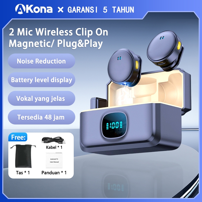 Akona Magnetic Mic Wireless Clip On 2 Microphone Wireless Clip On Noise Reduction Plug & Play Mikrofon Hp Konten Kreator Tampilan Digital LED With Charging Case(Free Tas1)