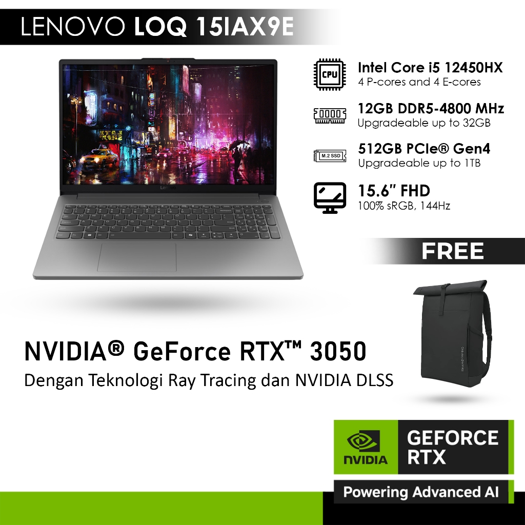 LENOVO LOQ ESSENTIAL 15IAX9E GeForce RTX™ 3050 6GB - i5 12450HX 12GB 512GB WINDOWS 11 +MICROSOFT® 365 BASIC 15.6FHD 144H