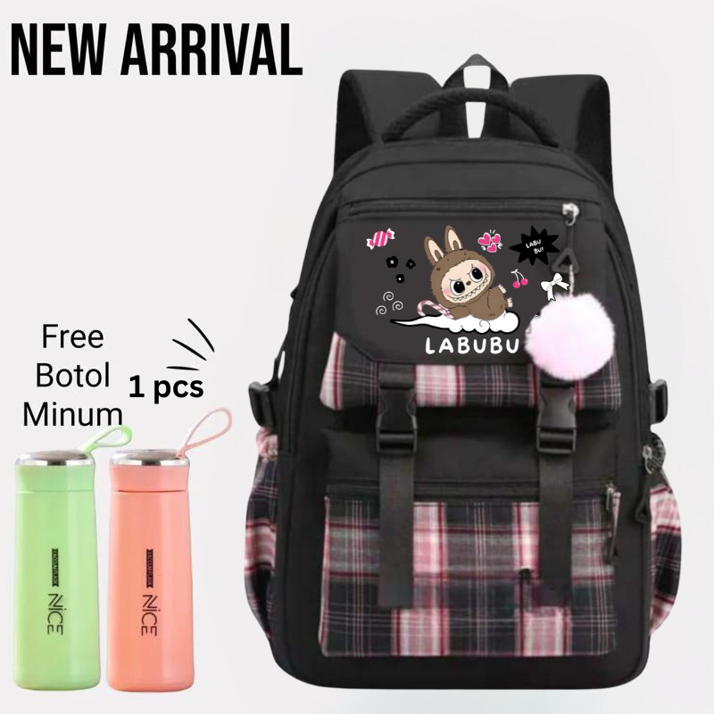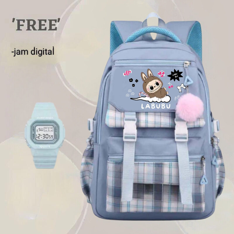 Tas Ransel Anak Perempuan Labubu Tas Ransel Anak Sekolah SD Bonus Botol Minum Jam Tangan ATK