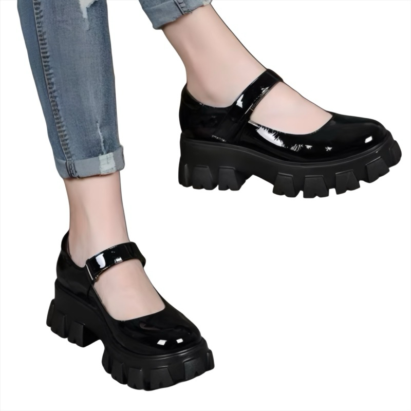 Sepatu Mary Jane Hak Tahu Tinggi Wanita Import Kulit Murah Premium Marun Hitam Sol Karet Strap Docmart Cewek High 5
