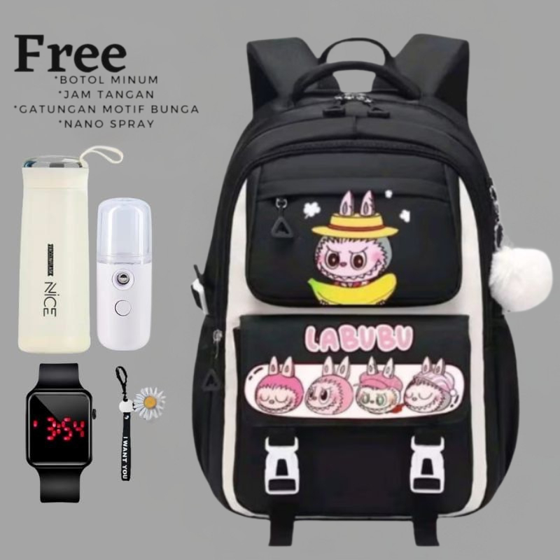 Tas Anak Labubu -Tas Ransel Anak Perempuan Labubu Tas Ransel Anak Sekolah SD Bonus Botol Minum Jam Tangan ATK Aksesori Modis untuk Anak-Anak Aktif - Fashion