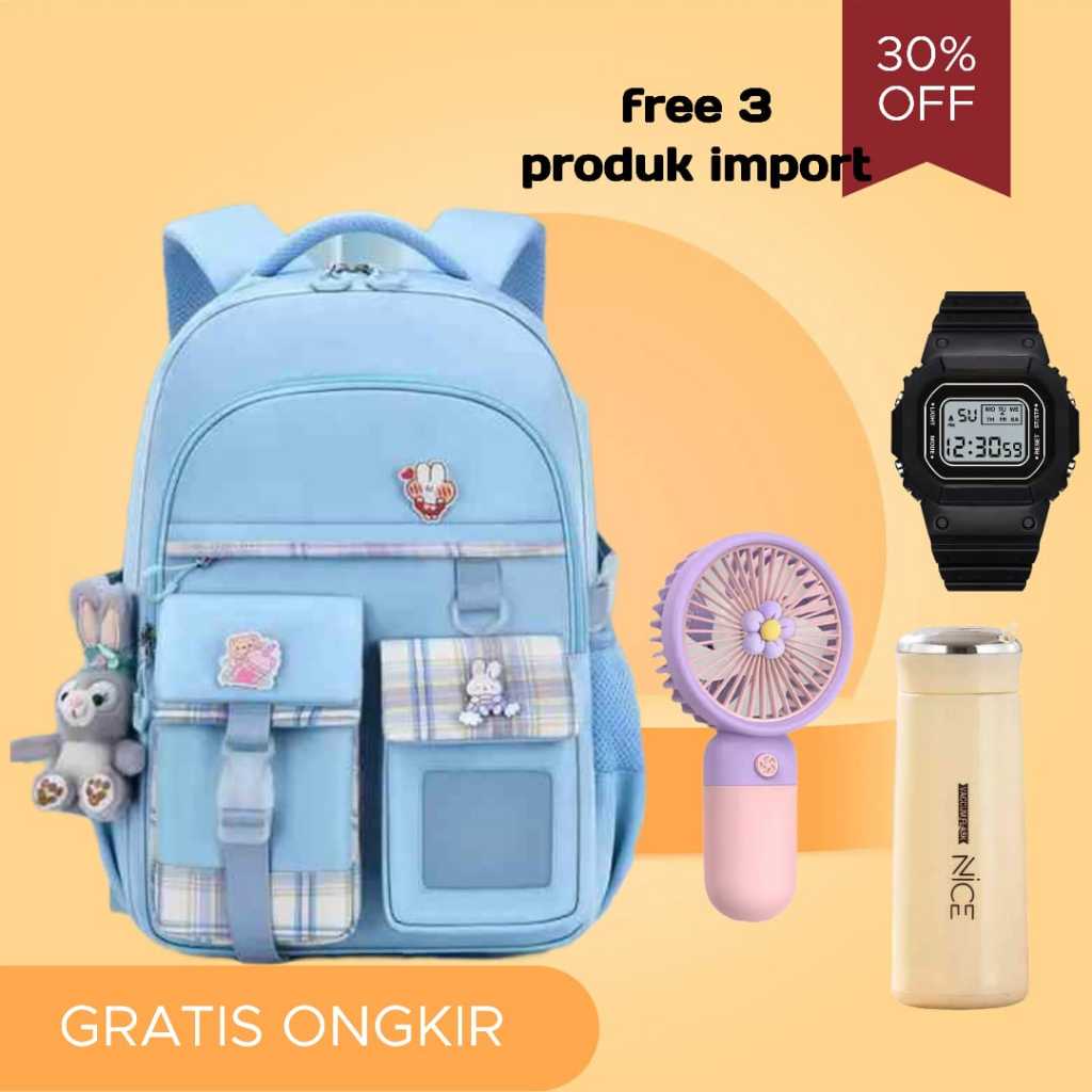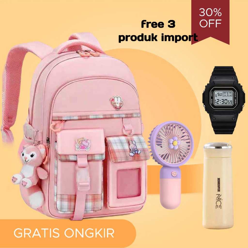Olshopgrosirbandung - Tas Ransel sekolah anak SD SMP SMA dengan 1 boneka dan pin hiasan size besar muat banyak Tas Ransel Korea Fashion Import