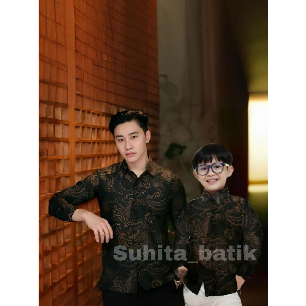 Kemeja Batik Motif Cundamani Batik Anak Laki-Laki Lengan Panjang Batik Ayah dan Anak Cowok Warna Hitam Coklat