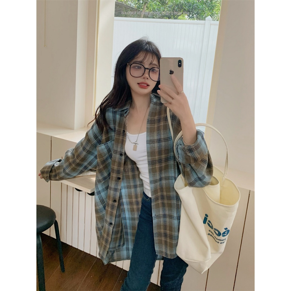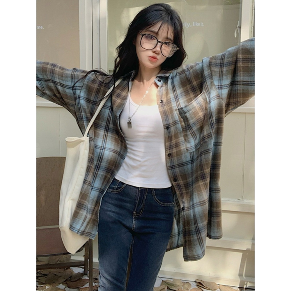 SOSO Kemeja kotak-kotak biru wanita, tunik longgar musim panas, atasan pelindung sinar matahari kemeja wanita