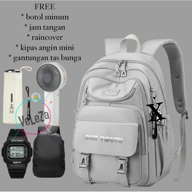 Tas Sekolah Ransel Anak Perempuan Remaja SD SMP model ourr youth gratis botol minum kaca jam tangan raincover kipas angin mini dan gantungan bunga Tas ransel