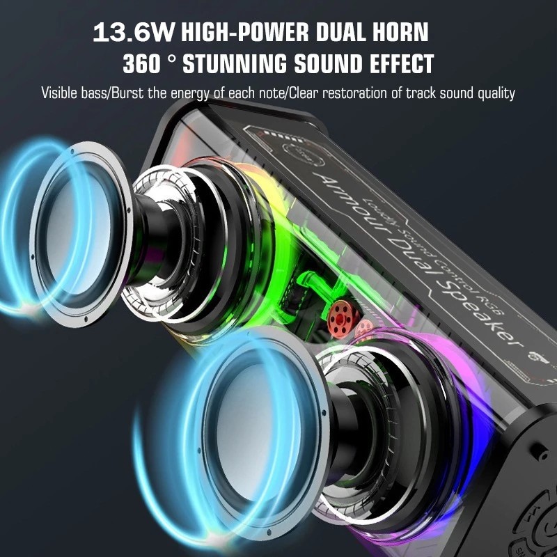 Mecha Speaker Bluetooth Subwoofer Baja Kecil Transparan Audio Portabel Nirkabel Rgb 7 Color Light V8 Speaker Bluetooth Tws Series Bass 360 ° 13.6w Mecha Warna-Warni Stereo Surround