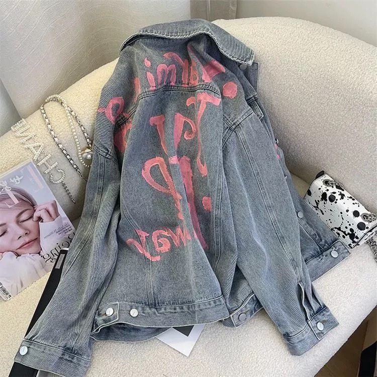 Jaket Denim Motif Huruf Grafiti Jaket Lengan Panjang Longgar