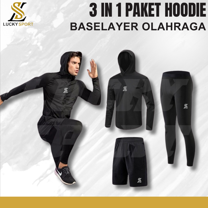 PAKET 3 in 1 Baselayer Hoodie Manset Olahraga Celana Pendek Dan Legging Panjang Running Gym outfit Olahraga Santai Nyaman