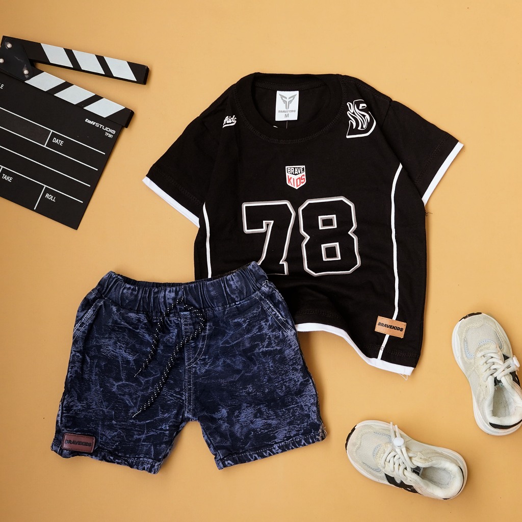BRAVEKIDS SETELAN T - SHIRT KAOS TWO LAYER BASEBALL DAN CELANA COTTON DENIM FASHION