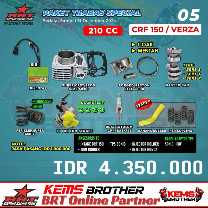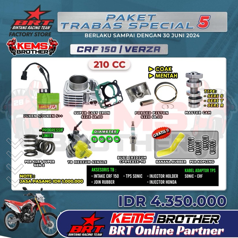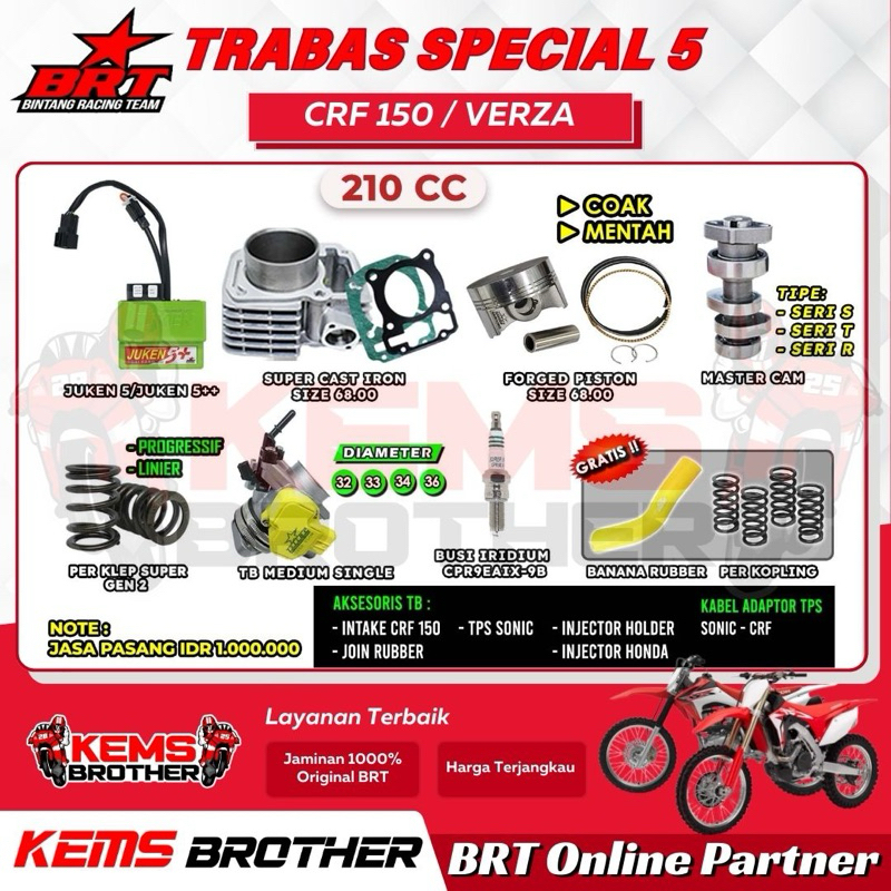 PAKET ORIGINAL BRT CRF150 TRABAS SPESIAL 5 BOREUP 210CC (ECU JUKEN 5+ HIJAU, SILINDER BLOK CASTING IRON 66 68, PISTON KIT, NOKENAS, BONUS BUSI RACING IRIDIUM, BANANA RUBBER PERKOPLING, PERKLEP)