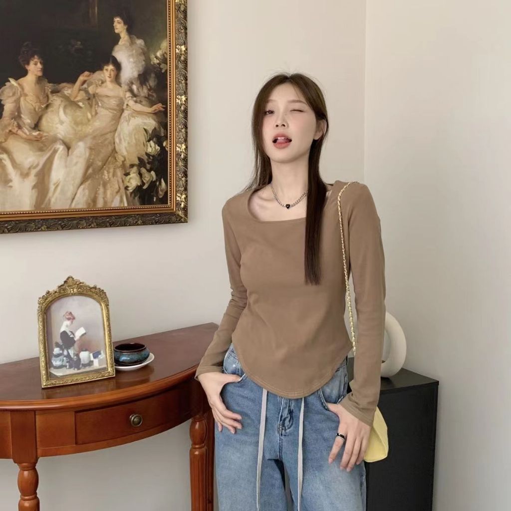Square Neck Long Sleeve Shirt Blouse/ Kaos Polos Wanita Korea Spandek long Sleeve