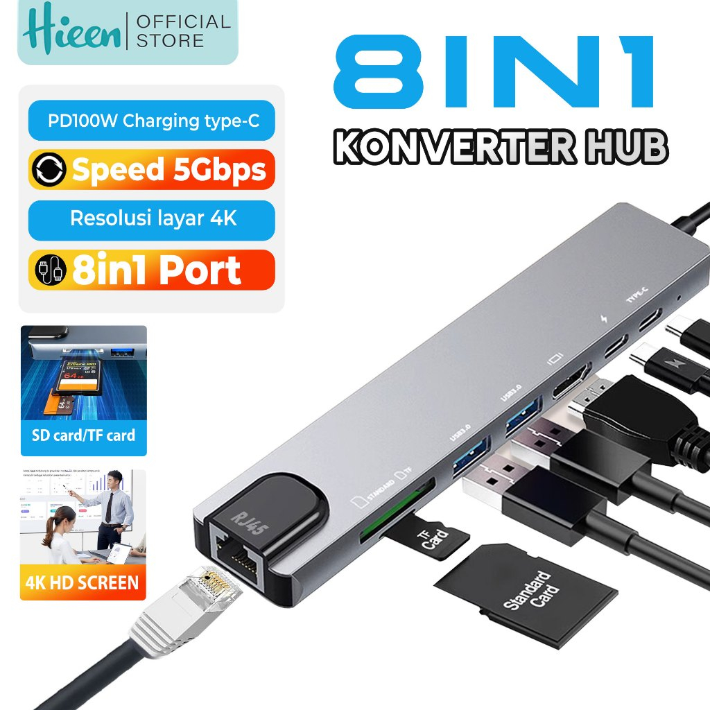 Hieen USB Konverter Hub 8in1 Multifungsi Port HDMI Type-c SD Card TF Card PC Tablet DS01