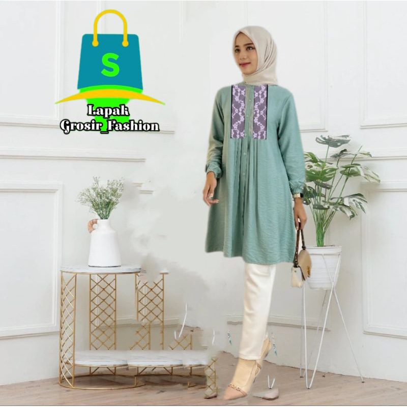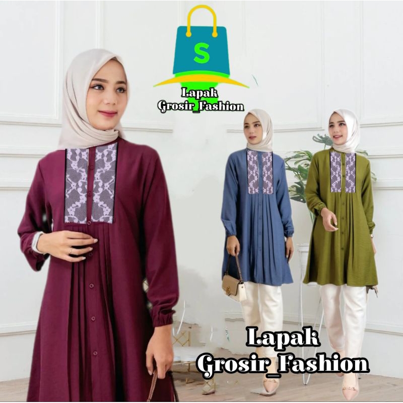 Tunik Fashion wanita Terbaru/Tunik bahan Crinkle airflow motif Renda Turky Kekinian/Atasan Tunik Wanita Ful kancing