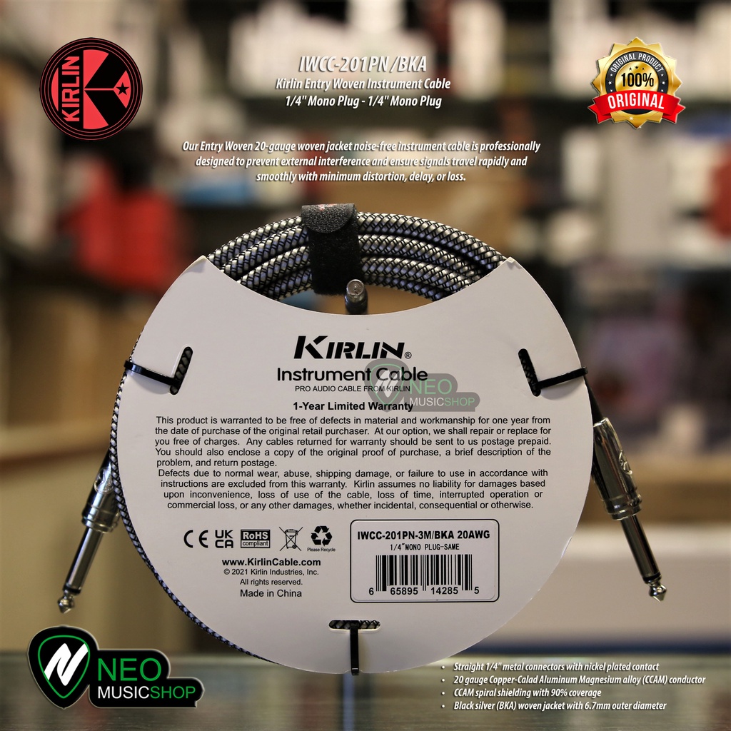 Kirlin IWCC-201PN BKA 3Mtr Entry Woven Instrument Cable 1/4" Mono Plug