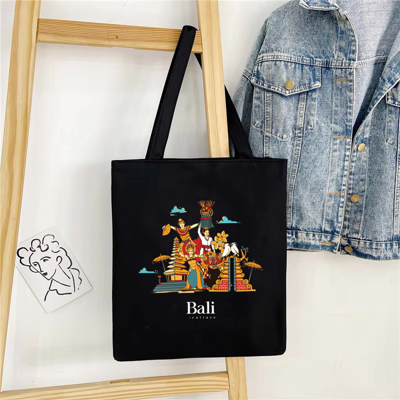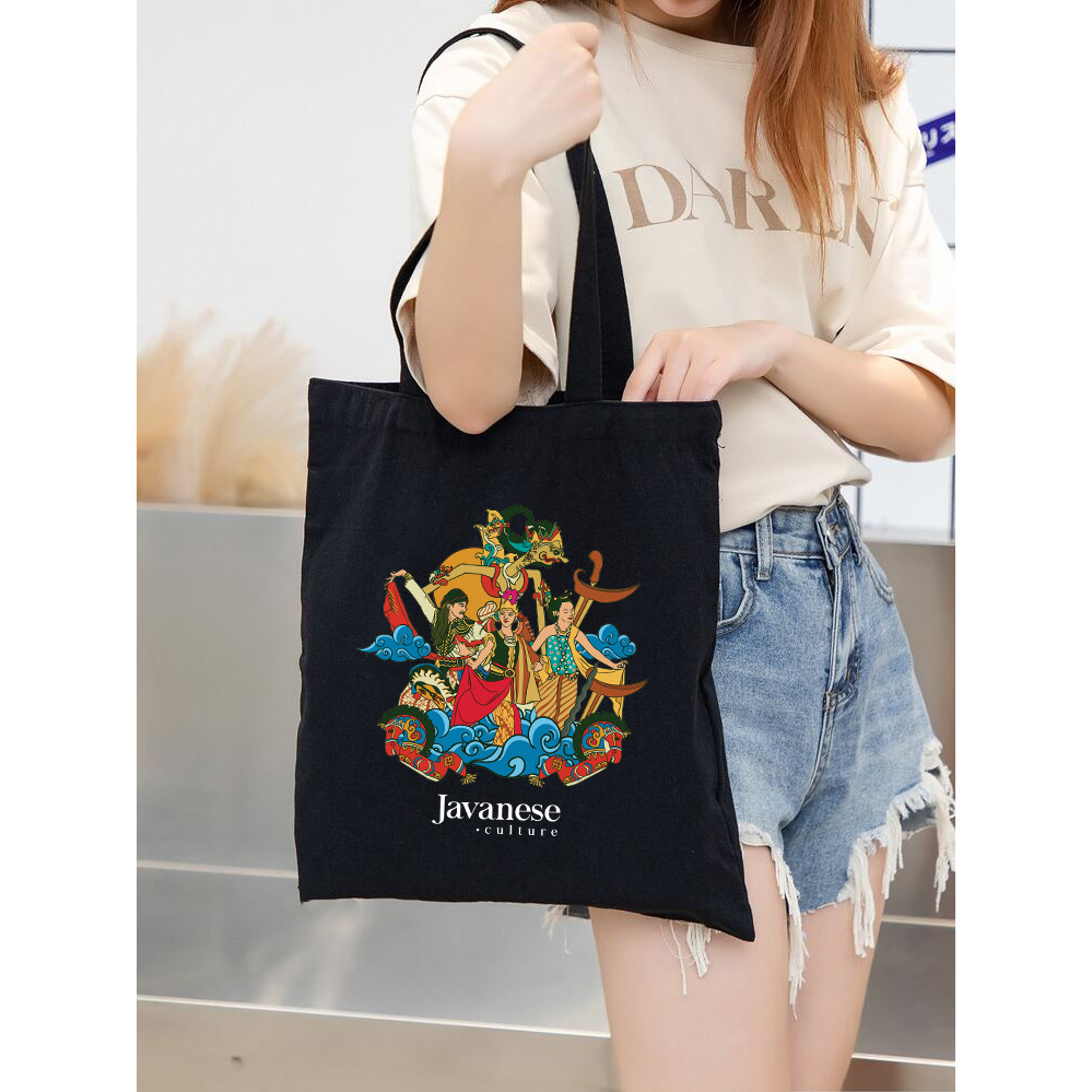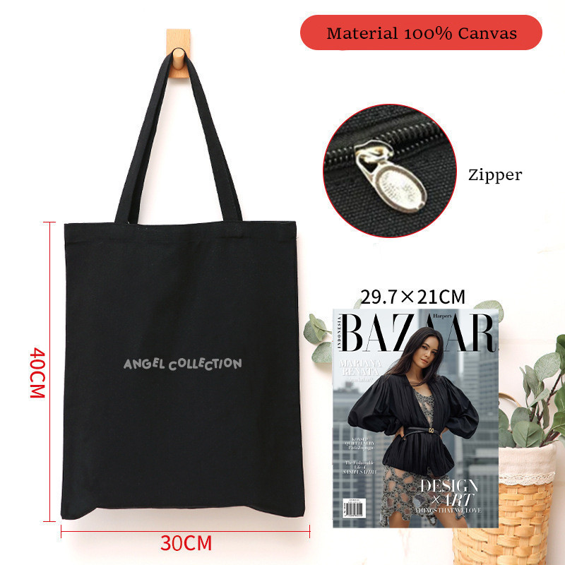 ENJEL Tas Tote Bag Hitam 100 PERSEN Kanvas Resleting Kota Indonesia untuk Oleh-Oleh Souvenir Aesthetic Ukuran 30x40 Enjel