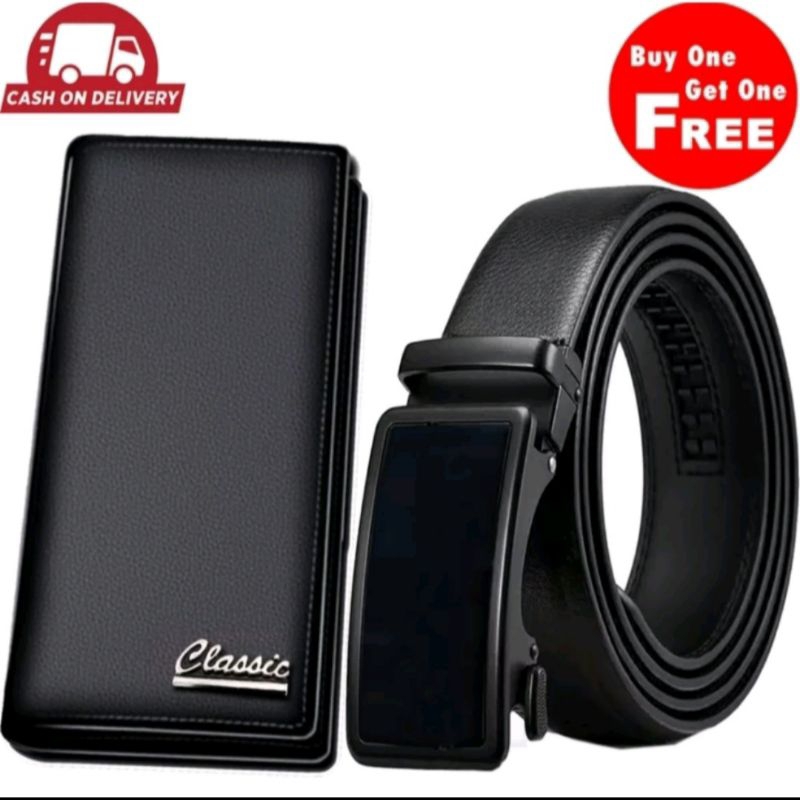 Beli 1 geratis 1 ikat pinggang rel anti gores sabuk pria kulit sintetis + dompet Panjang Classic FREE BOX