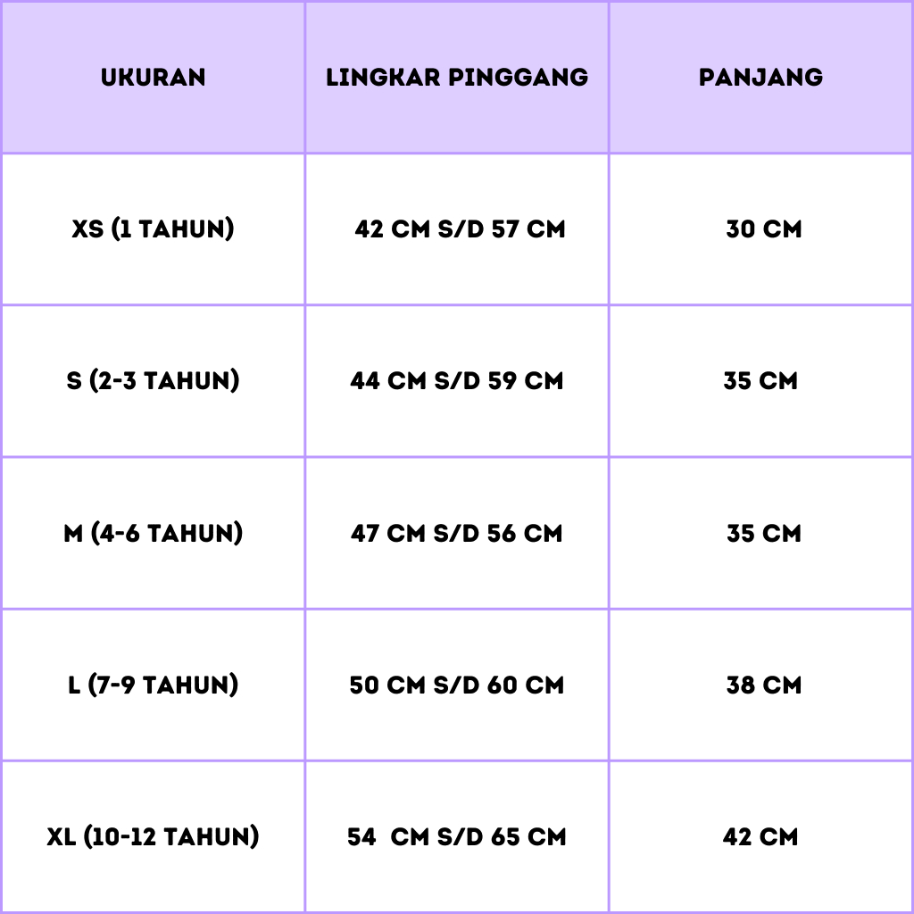 S(2-3tahun), M(4-6tahun), L(7-9tahun), XL(10-12tahun)